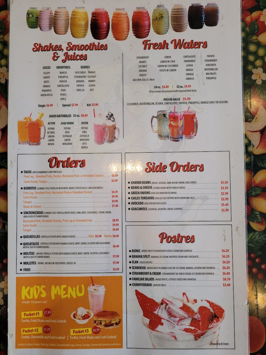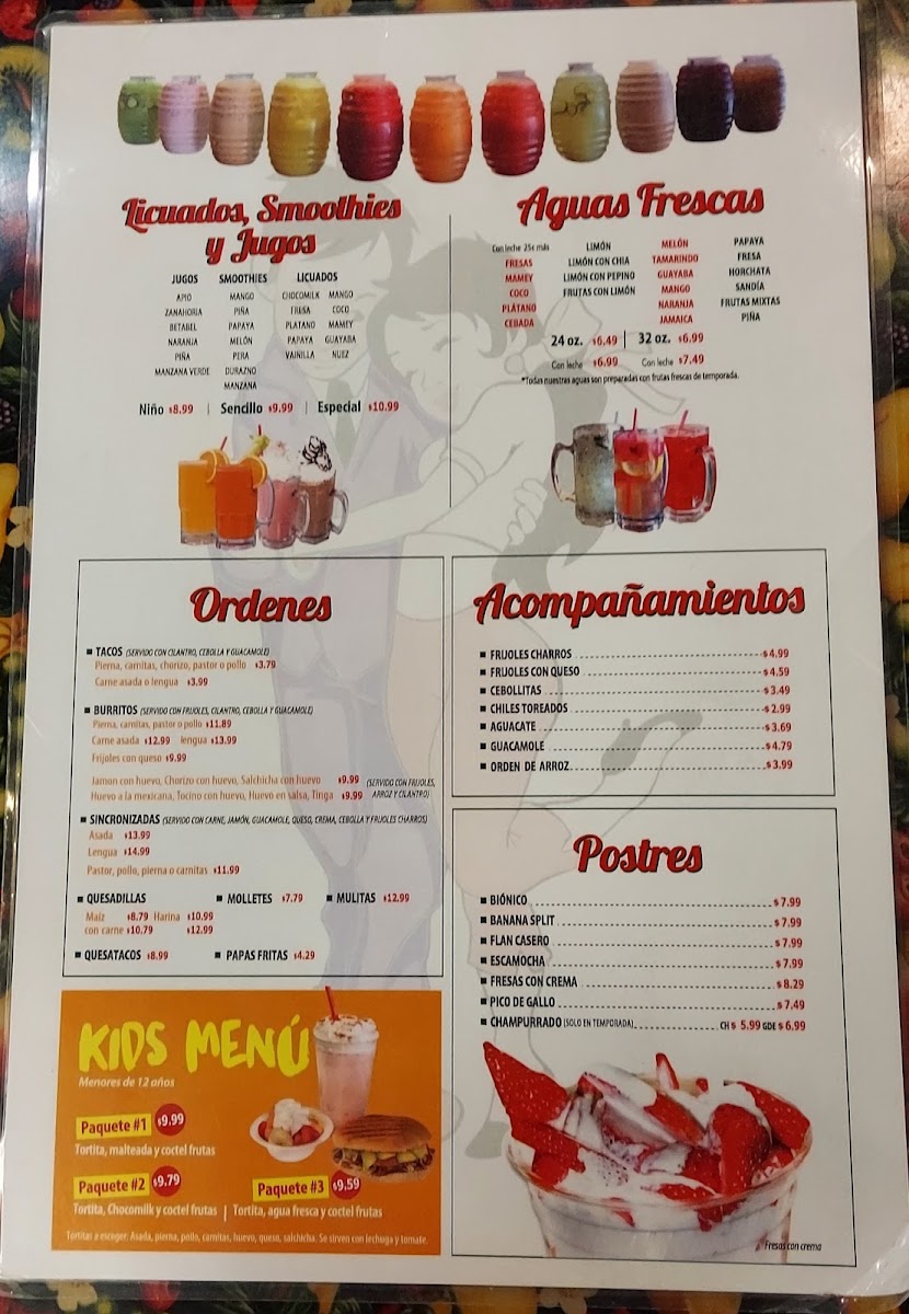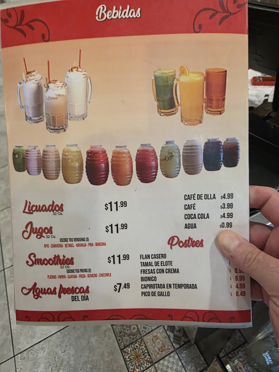 Beverages include a selection of aguas frescas, such as Agua de Fresa (strawberry), Agua de Sandía (watermelon), and Agua de Pepino (cucumber), as well as smoothies. These drinks complement the food menu and provide refreshing choices suited to a variety of preferences.